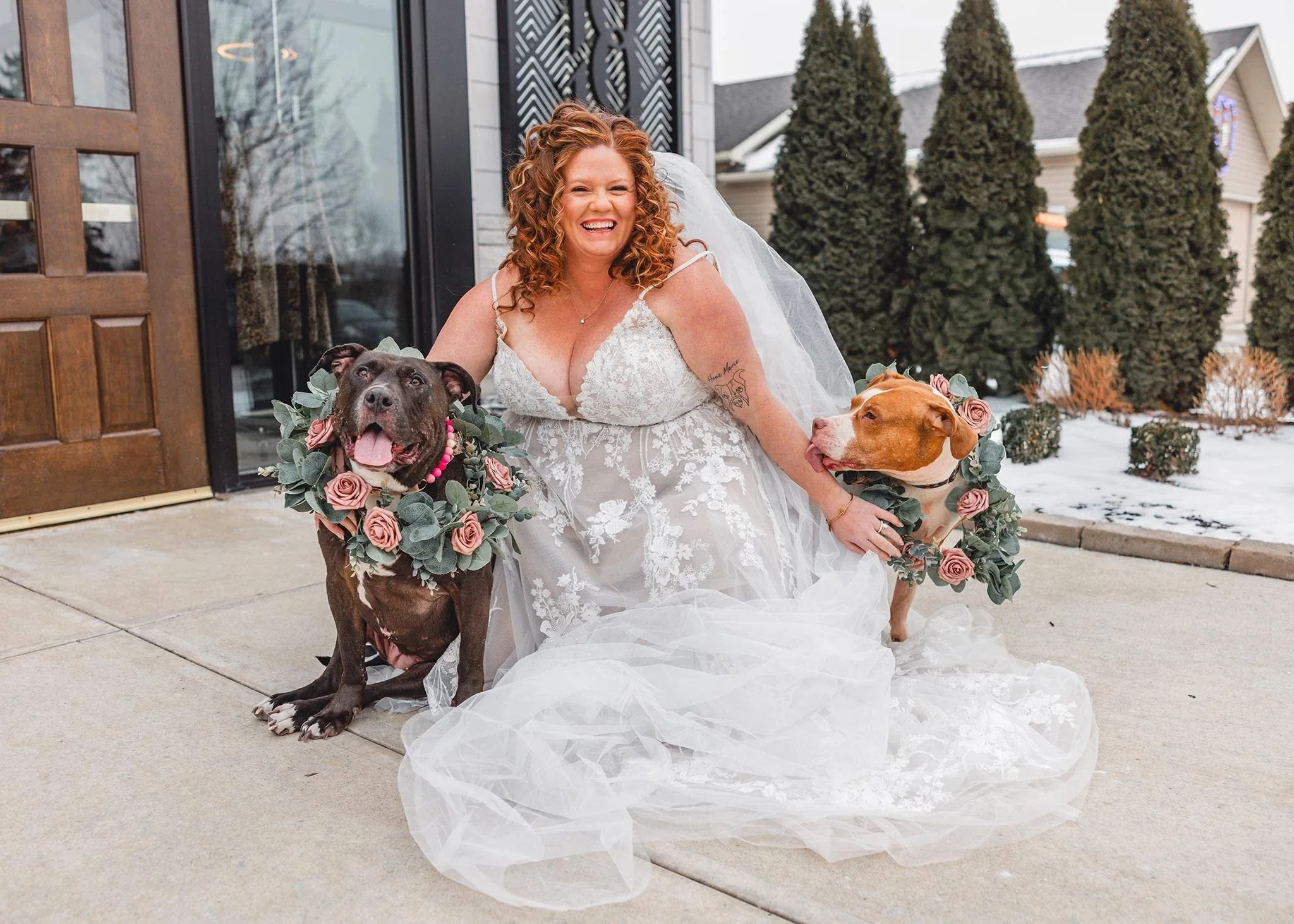 Kristen is the founder/owner of Blockheads & Bows Pet Services LLC. She created B & B in November 2021 while searching for a daycare for her own dogs, Enzo and Royal (pictured here with Kristen on her wedding day). Realizing something was missing from the local market for bully breed/special needs pets, an idea was quickly born. Her goal in creating B & B is to provide safe, loving care for dogs of all breeds.